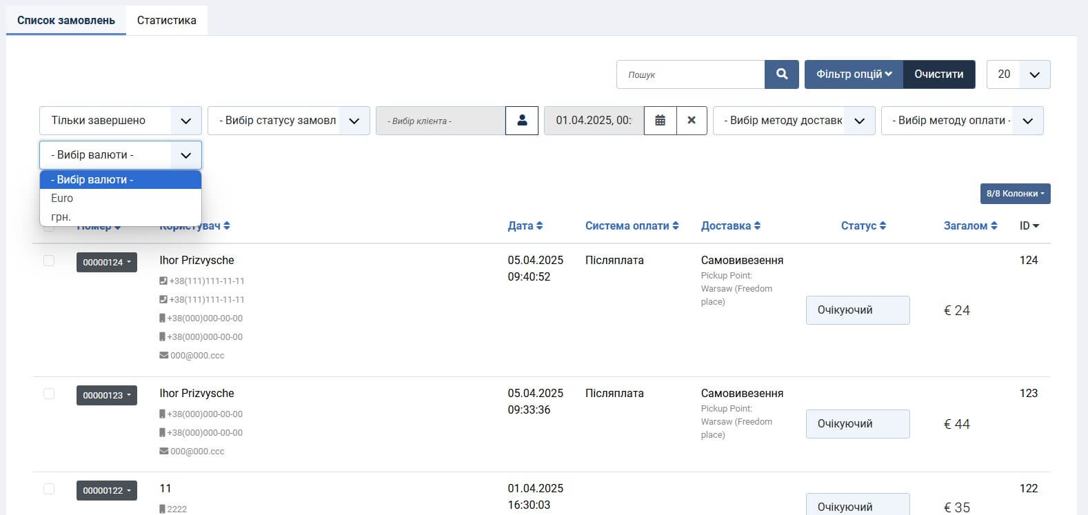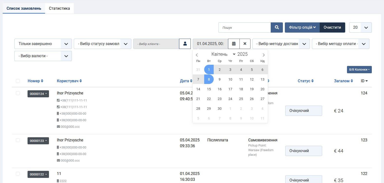 И все это в дополнение к развитой системе фильтрации с дополнительными фильтрами: за пользователем, по периоду (удобный выбор в календаре), способу доставки, способу оплаты, валюте заказа.