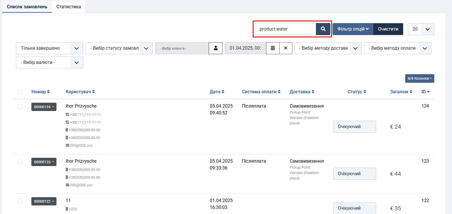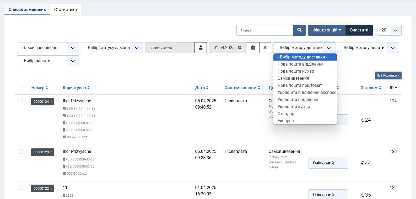 Созданы дополнительные удобные фильтры для просмотра заказов, а также расширенная система поиска заказов по разным признакам: id заказа, номера заказа, е-мейла клиента, имени клиента, фамилии клиента, телефона, мобильного телефона в основном адресе и адресе доставки, а также по параметрам доставки. И конечно по названию товара/ов в заказе