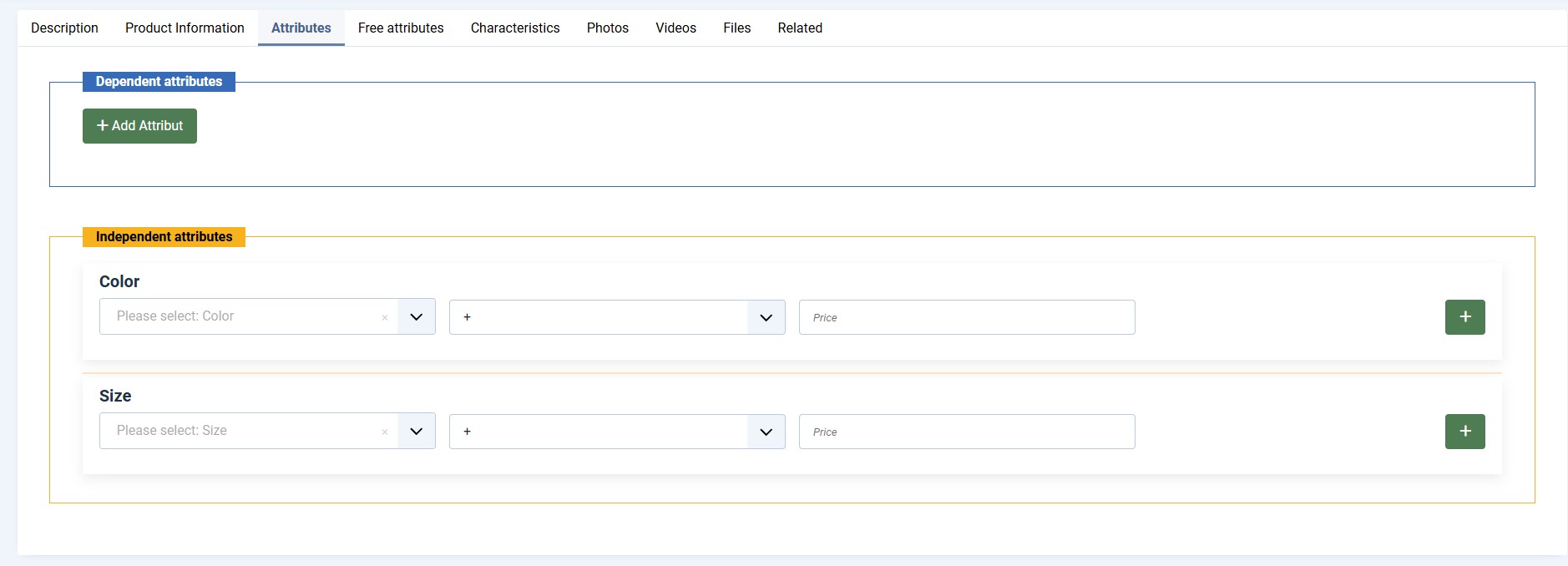- Вкладка "Атрибуты" — позволяет быстро добавлять зависимые атрибуты (один-ко-многим или многие-ко-многим). Каждая связка атрибутов отображается отдельным блоком с наглядными полями для заполнения. Если создана только часть связок, остальные атрибуты не мешают выбору — доступны только те, которые можно назначить. Также есть возможность создавать независимые атрибуты или изменять существующие без удаления.