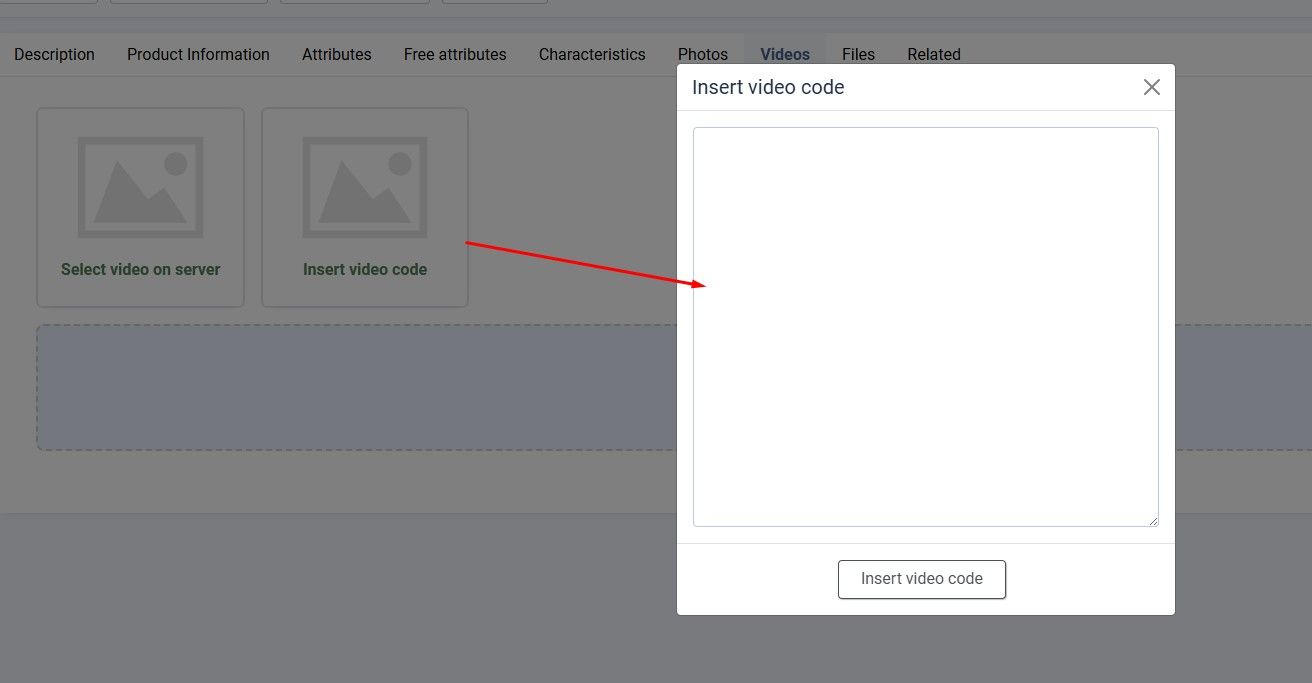 - Вкладка "Видео" — дает возможность добавлять видеофайлы, выбирать их на сервере через MediaManager Joomla или вставлять код с видеосервисов.