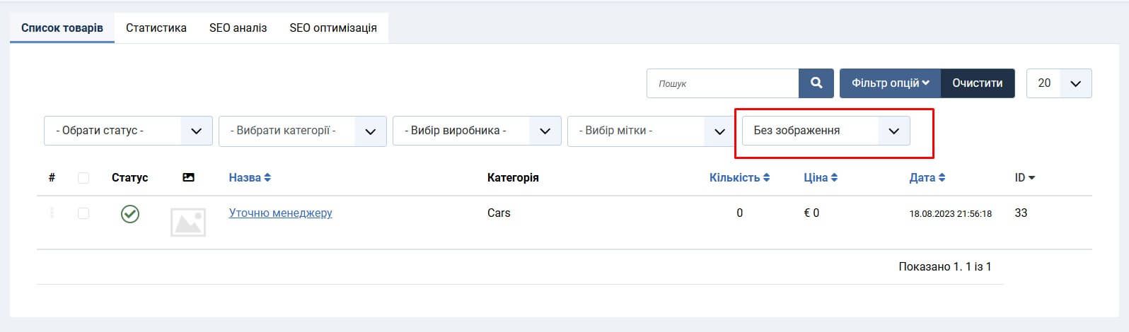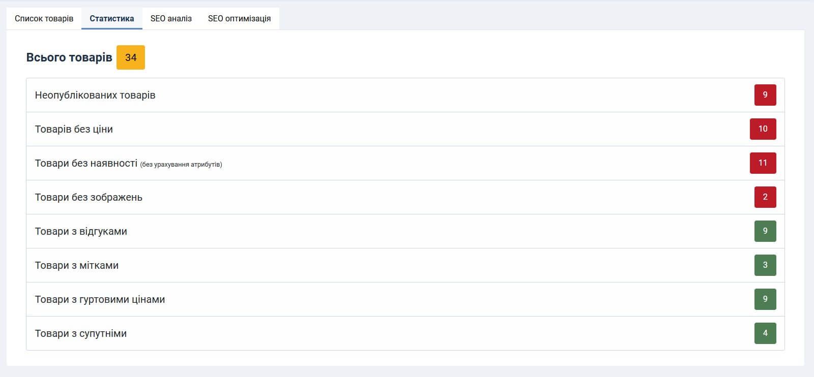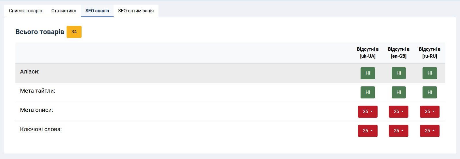 Внедрен SEO анализатор, который предоставит Вам возможность просмотреть проблемные товары без заданных первичных SEO параметров товаров, необходимых для хорошего продвижения страниц товаров Вашего магазина в поисковых системах.