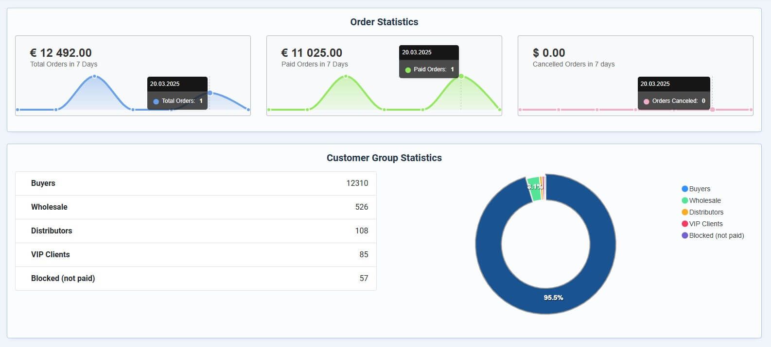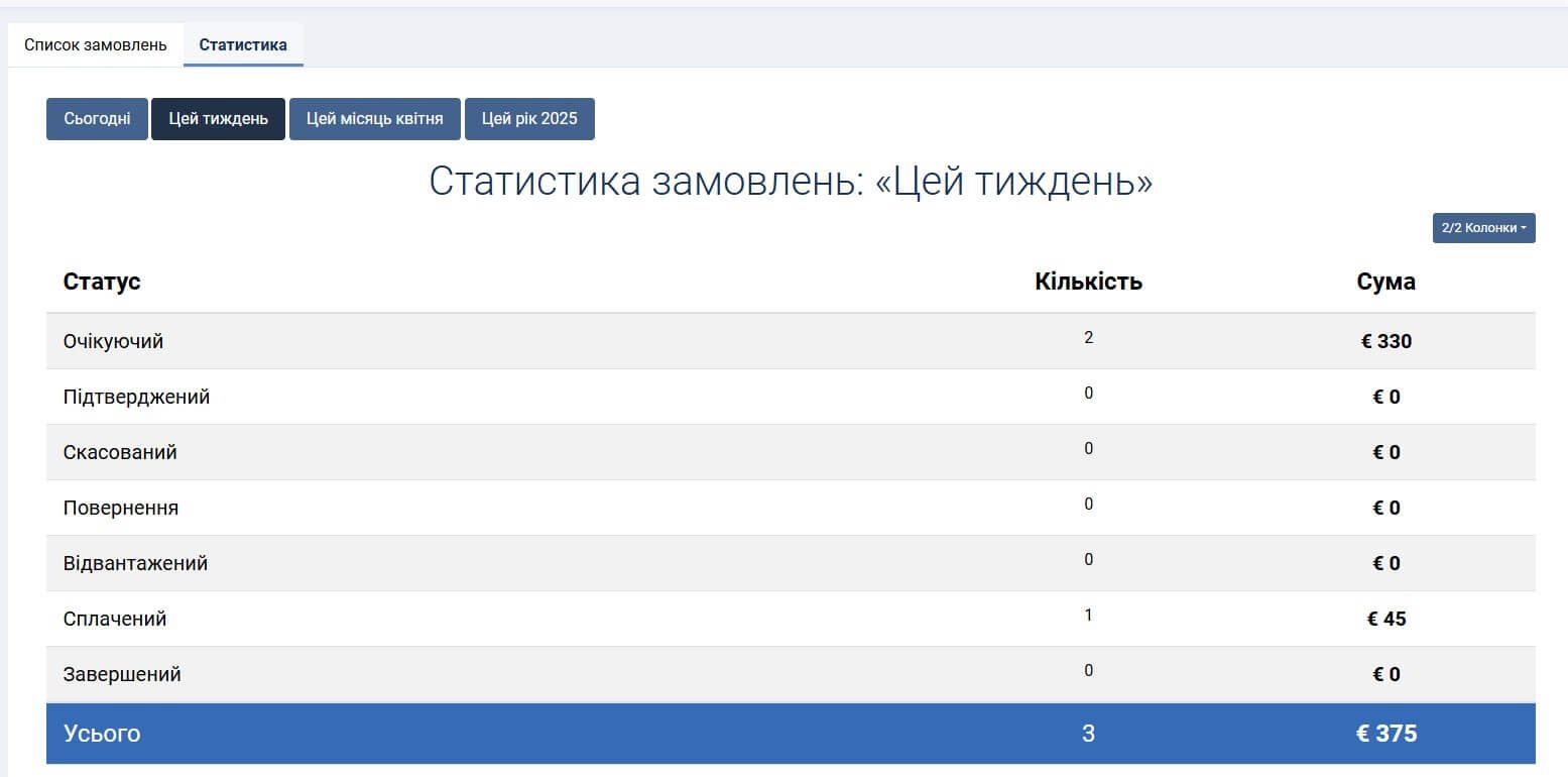 А также позволяет просмотреть базовую статистику заказа за день, неделю, текущий месяц, текущий год.