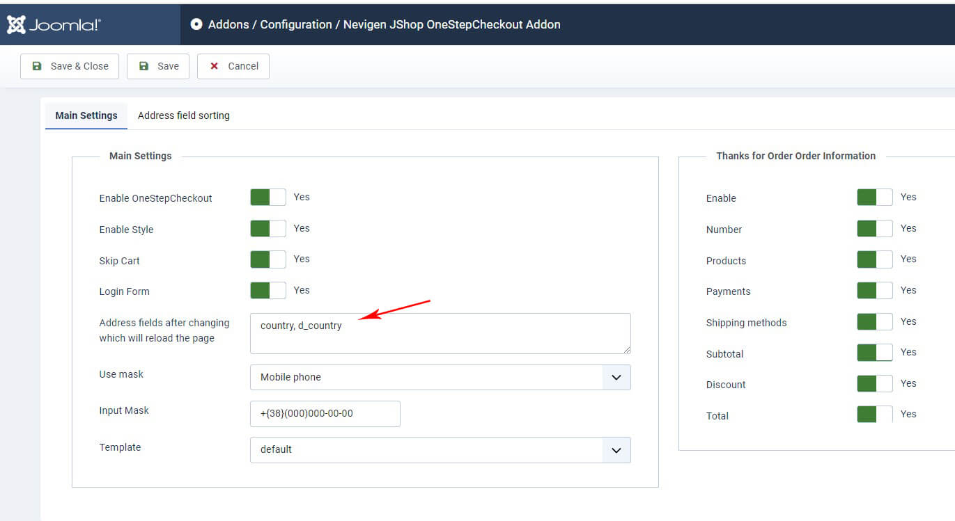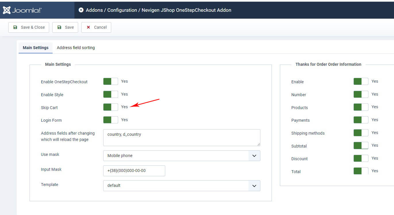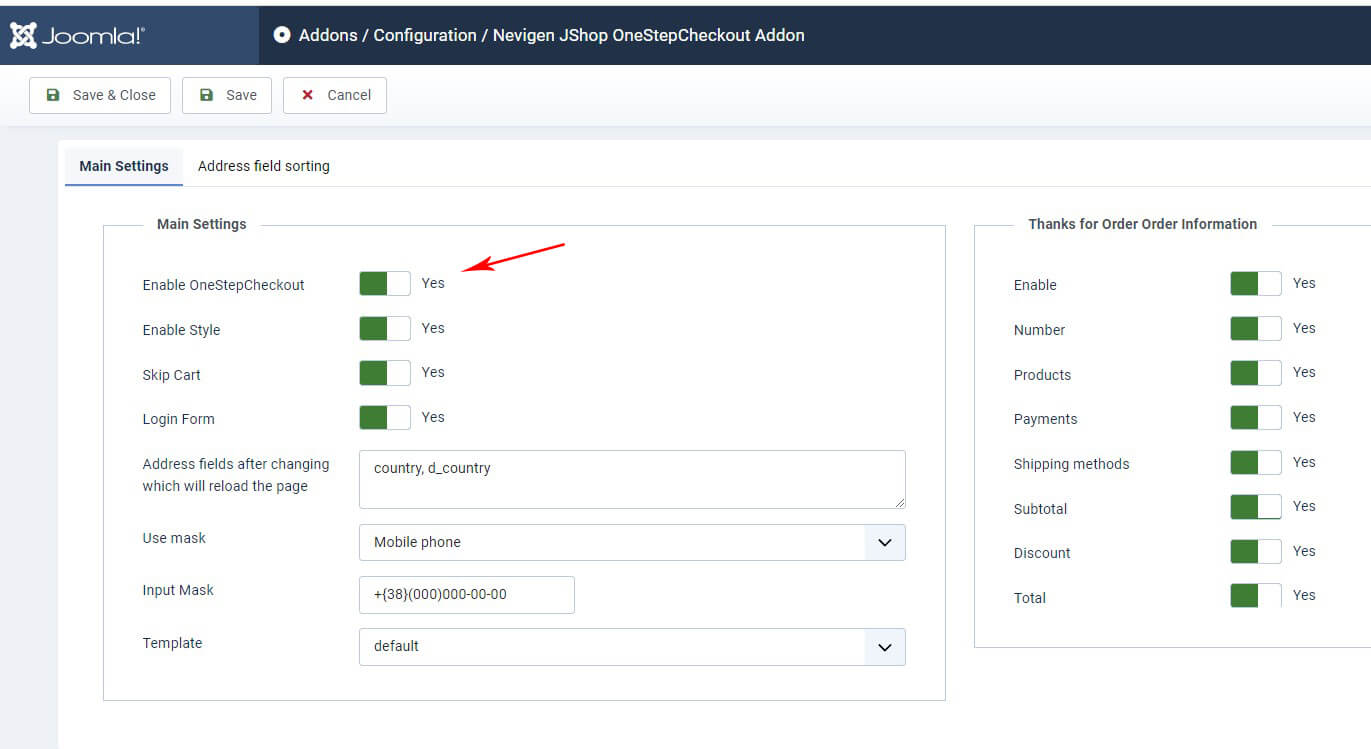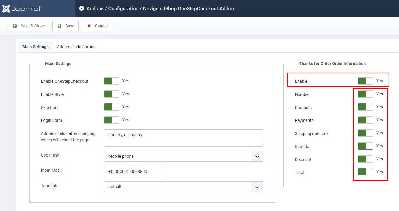 Настройки находятся в JoomShopping → Опции → Дополнения → Nevigen JShop OneStepCheckout Addon → Конфигурация