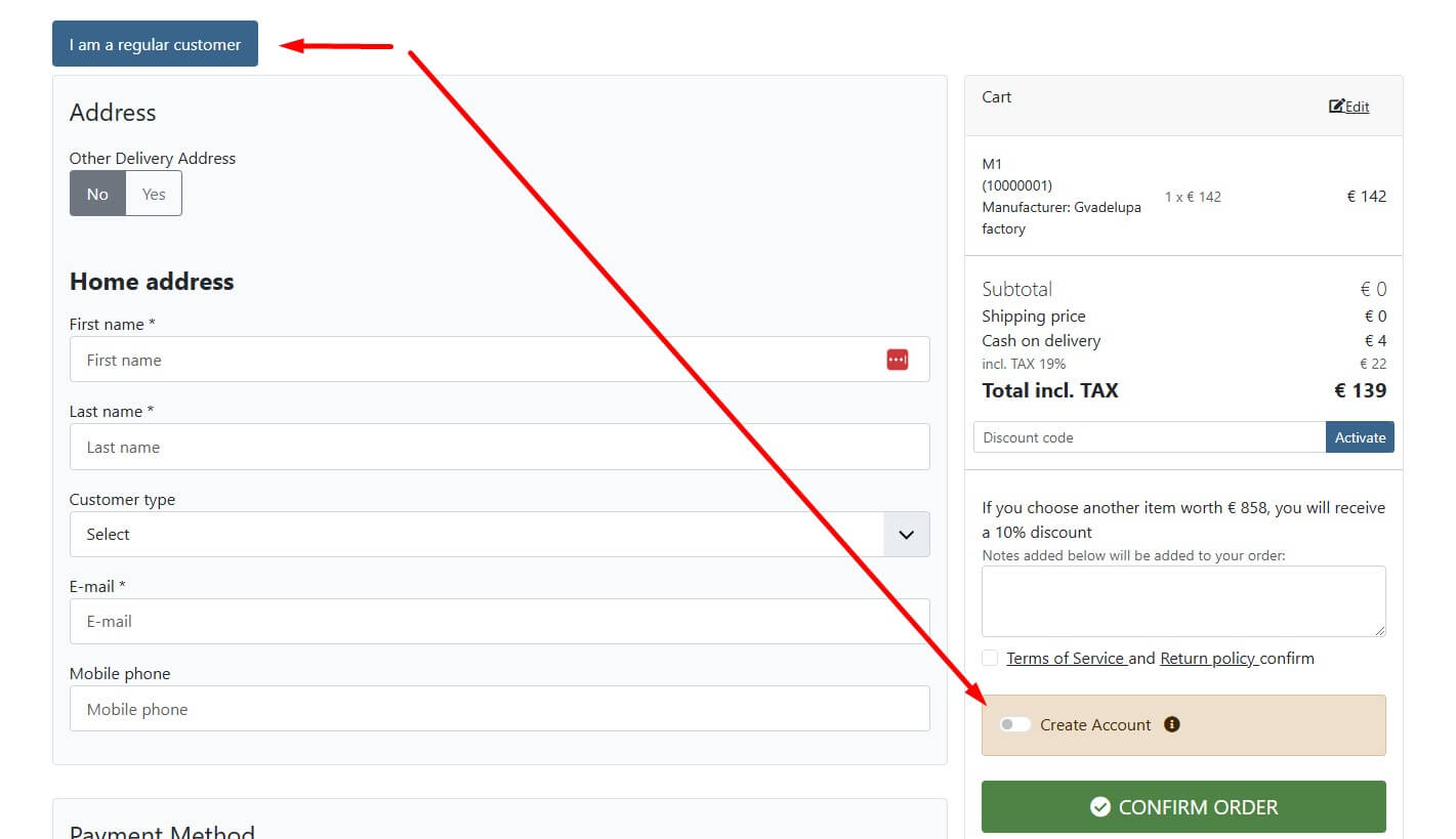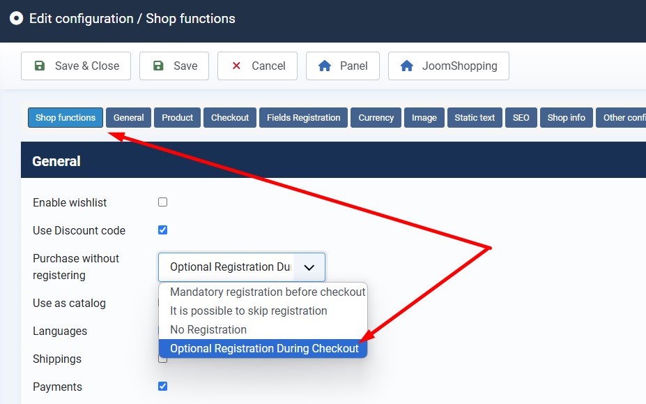 Нужно заметить, что регистрация при оформлении заказа доступна при настройке Joomla и JoomShopping