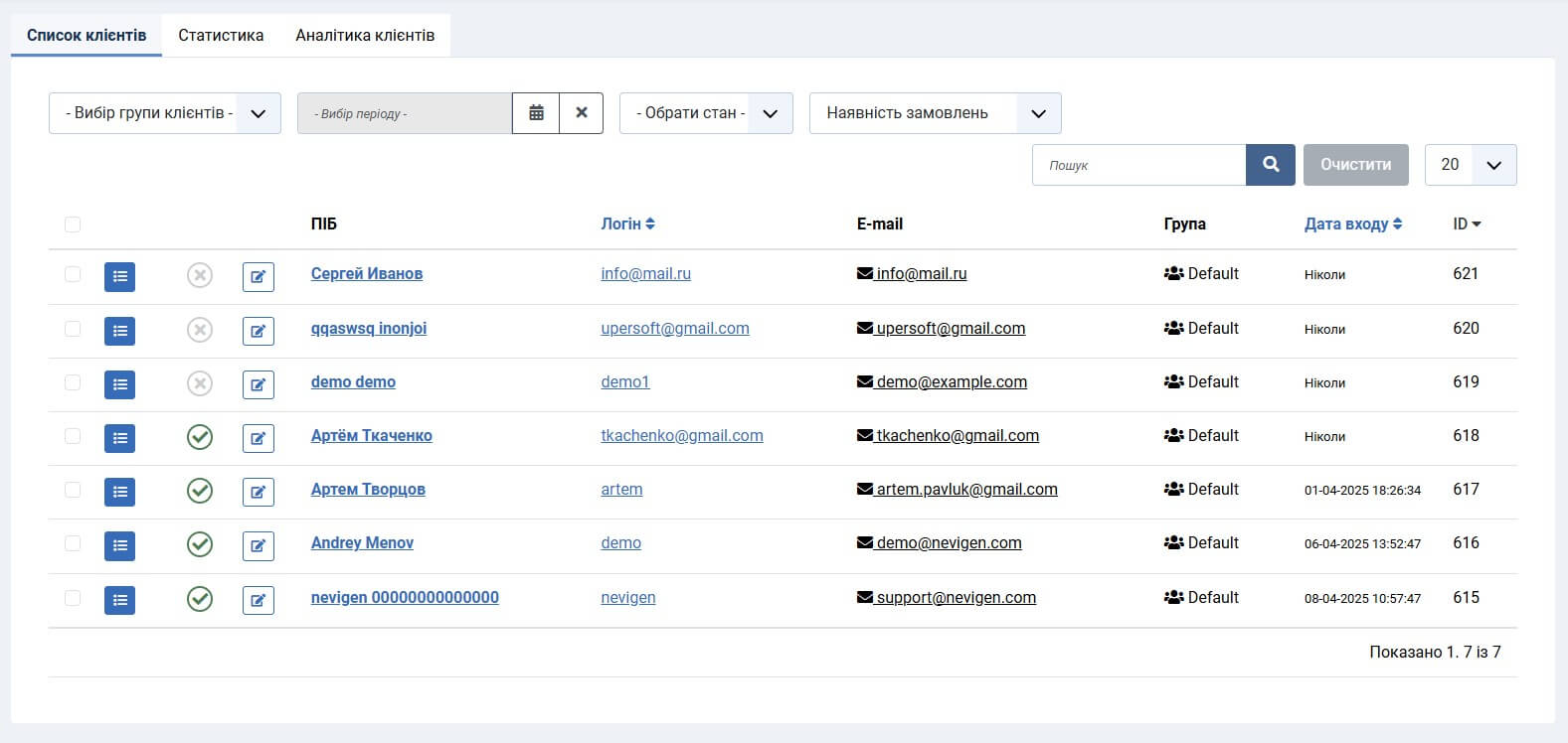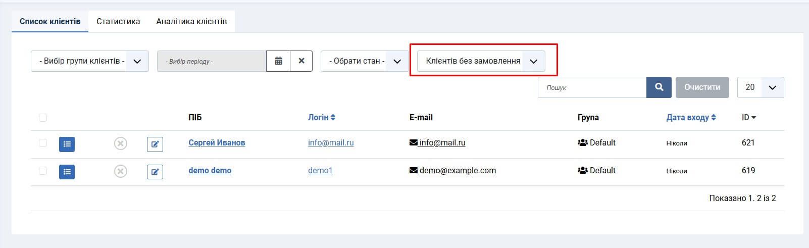 Создан дополнительный удобный фильтр для просмотра клиентов с заказами и без, а также возможность фильтра по периоду по дате входа клиентов.
