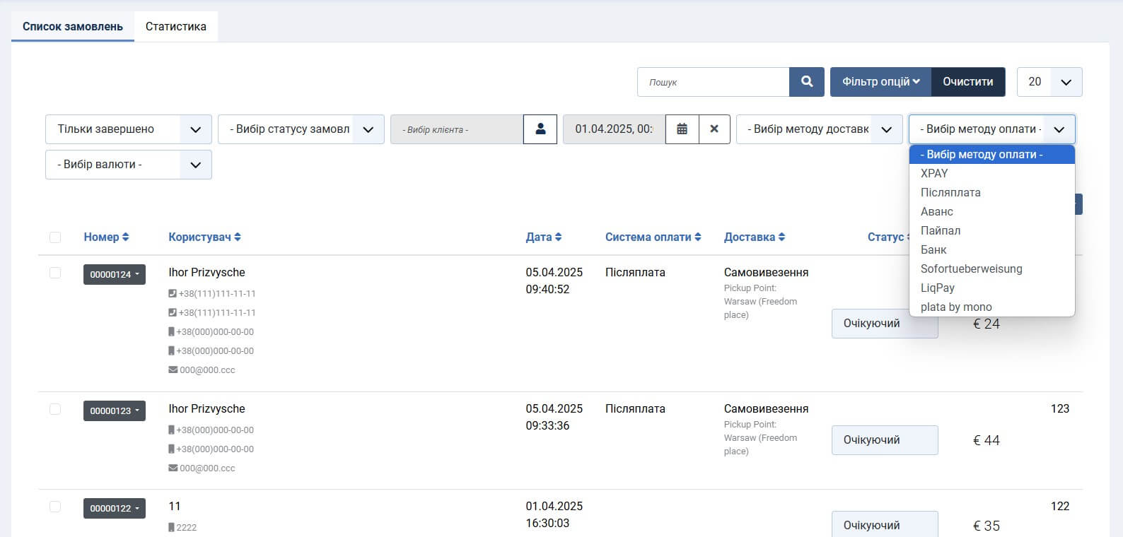 И все это в дополнение к развитой системе фильтрации с дополнительными фильтрами: за пользователем, по периоду (удобный выбор в календаре), способу доставки, способу оплаты, валюте заказа.