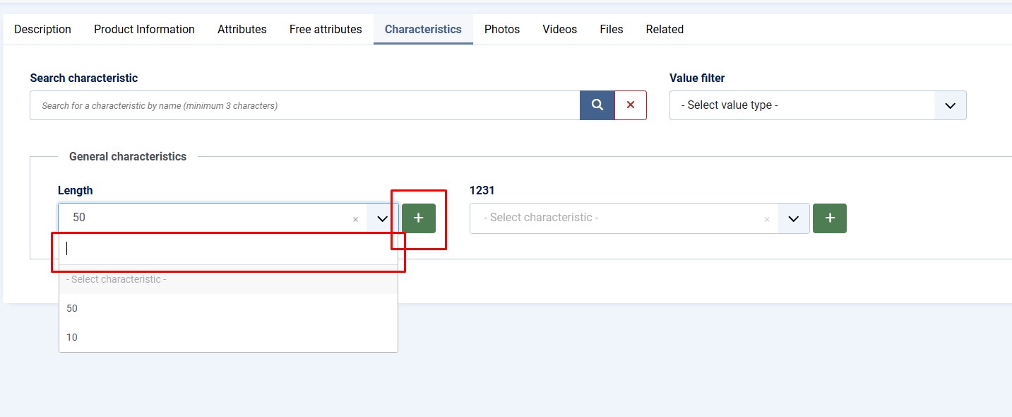 - Вкладка "Характеристики" — позволяет удобно выбирать или добавлять опции характеристик. Используются два основных типа: множественный выбор и уникальный текст. Остальные варианты вписываются в эту логику, что оптимизирует БД. Доступен удобный поиск и фильтрация по группам или заполненности. Новая характеристика автоматически назначается товару.