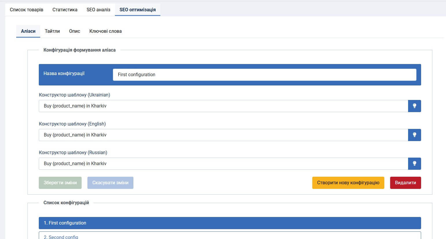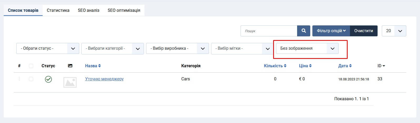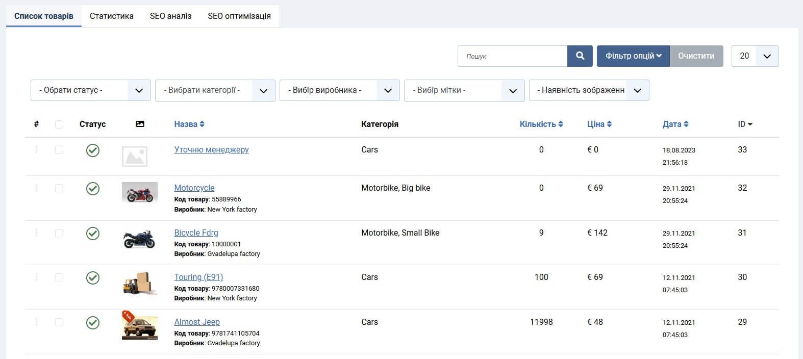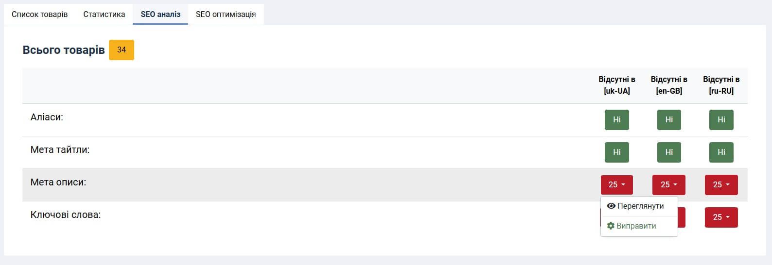 Внедрен SEO анализатор, который предоставит Вам возможность просмотреть проблемные товары без заданных первичных SEO параметров товаров, необходимых для хорошего продвижения страниц товаров Вашего магазина в поисковых системах.