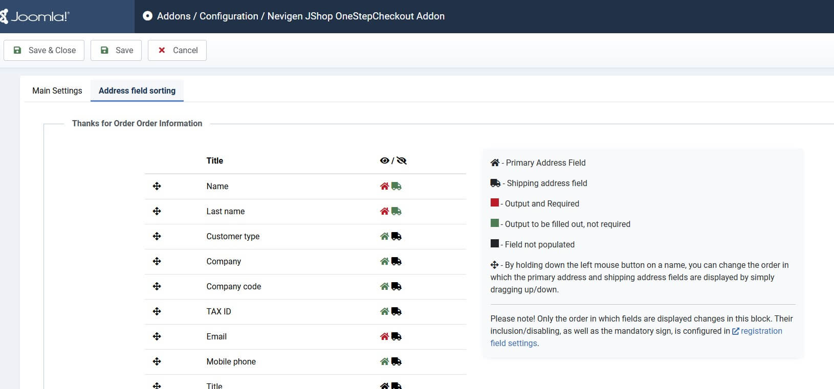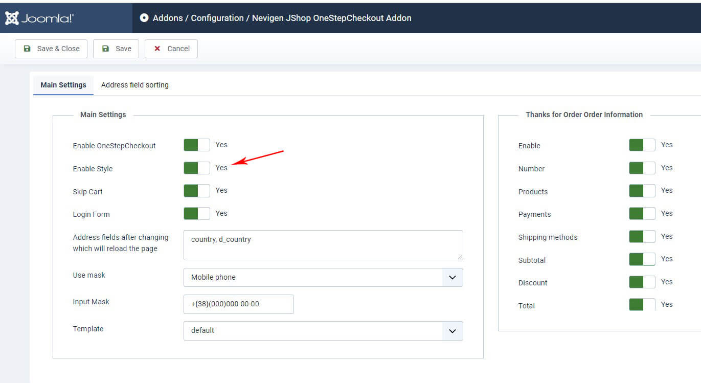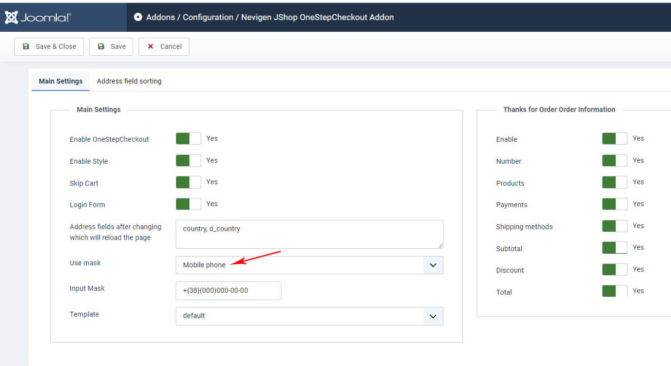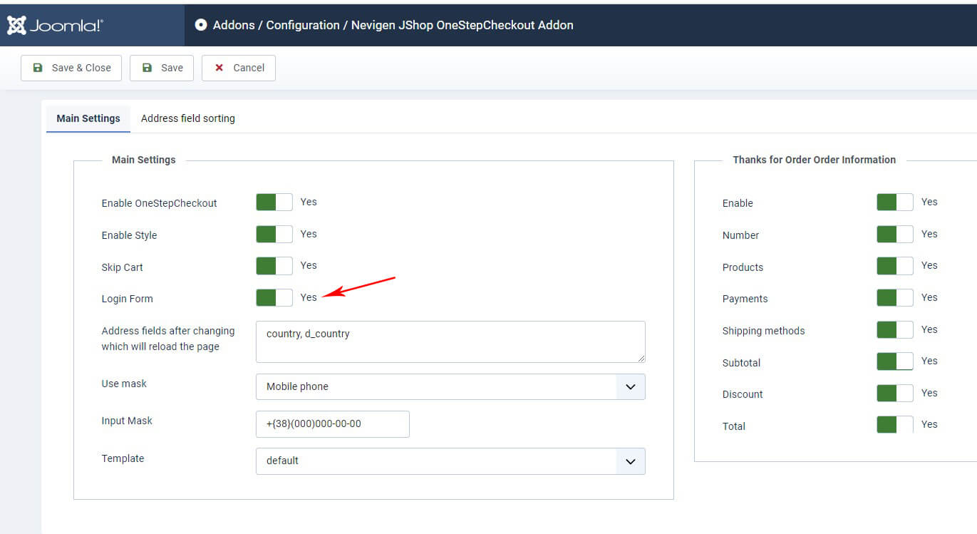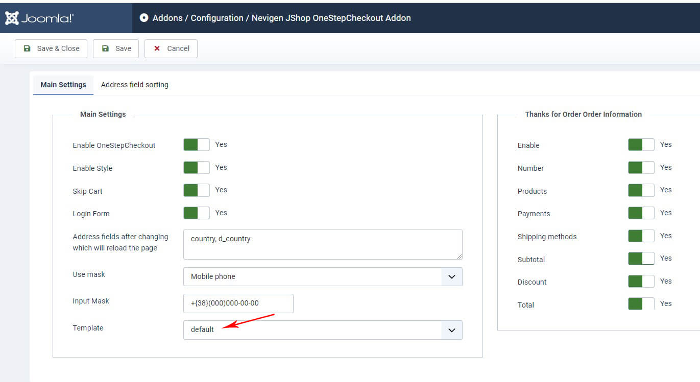Настройки находятся в JoomShopping → Опции → Дополнения → Nevigen JShop OneStepCheckout Addon → Конфигурация