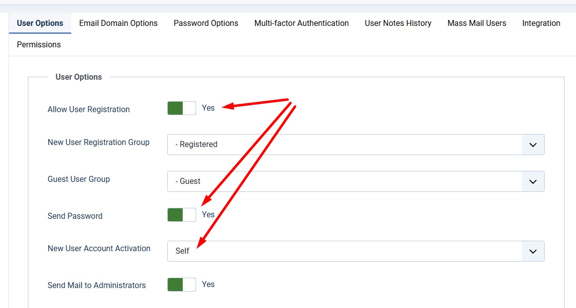 настройка регистрации пользователя должна быть определена: регистрация - включено, подтверждение регистрации - пользователем, пароль - отправляется на почту